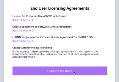 Review the license agreements and terms of service. If you agree to them, click I agree to the above to launch your instance.