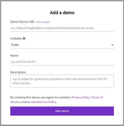 Under Name, give your demo a name. If you choose to make your demo public, the name of your demo will appear in the Lambda library of public models. The name of your demo will also appear in your demo’s URL.
